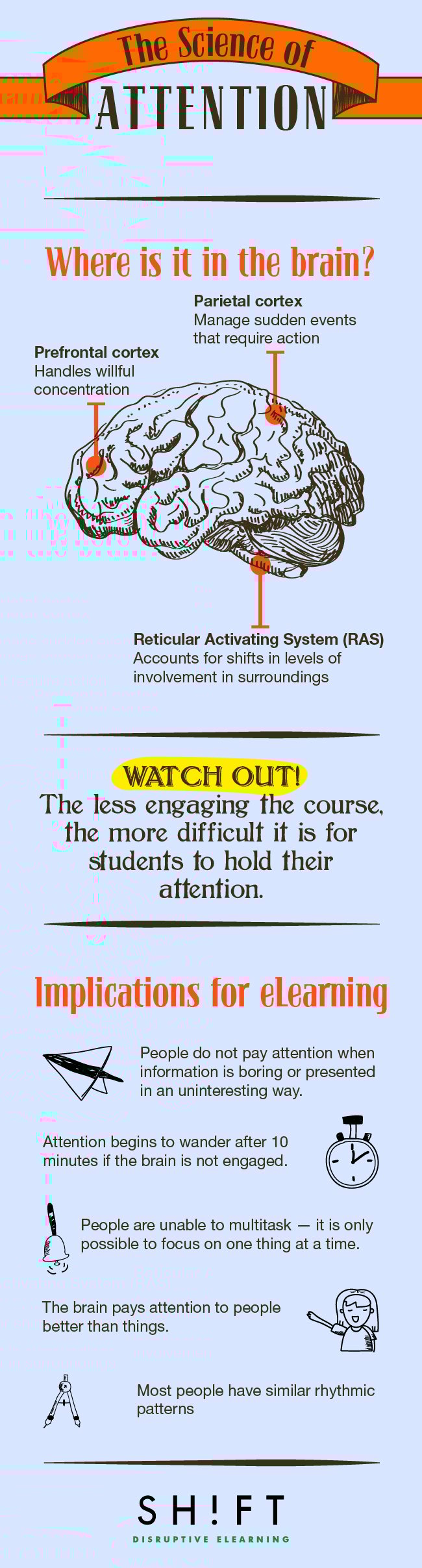 Paying attention is a task people take for granted; they rarely stop to think about the complex neurocognitive processes involved. However, it is an important topic for eLearning developers who are often so concerned about the superficial elements of their courses and neglect to learn how the brain works. After all, paying attention is the first step in the learning process, so ensuring learners pay attention is fundamental.