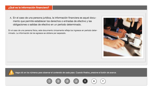 Example: Create an interactive screen to explain the financial planning process in your company. Learners have to click on the numbers to see the contents of each step.