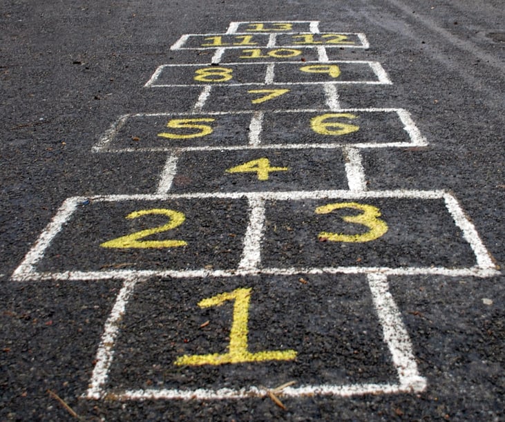 2) Lanzas un objeto al número 1 y brincas con un pie del 2 a 13. Se eleva la dificultad con los siguientes criterios: