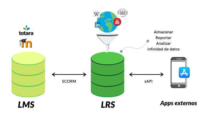 Un LRS almacena datos de la interacción con aplicaciones, plataformas sociales, otros sitios web, plataformas LMS y sistemas de talento, y produce reportes para tener un panorama amplio de las actividades offline y online de un usuario. Así, una empresa puede tener un control claro de todas las interacciones del usuario y su experiencia de aprendizaje fuera del LMS.