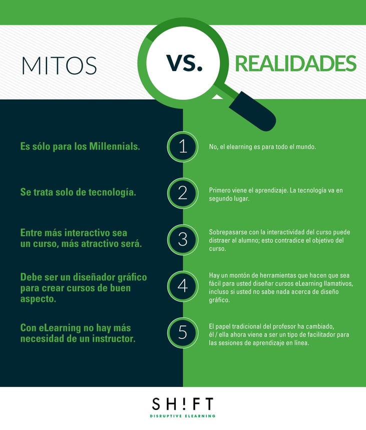 El eLearning es una de las tendencias más fuertes en la capacitación corporativa por el momento. Y como sucede con cualquier tendencia, el eLearning también está rodeado de mitos. Cuanto antes se rompan estos mitos, más fácil será concebir y crear cursos que proporcionen valor a un público más amplio.