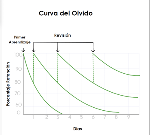 La curva del olvido, un concepto formulado por el psicólogo Hermann Ebbinghaus, ilustra la declinación de la memoria en el tiempo. Ebbinghaus encontró que, sin un repaso o reforzamiento, las personas tienden a olvidar hasta el 50% de la información nueva en la primera hora después de aprenderla. A medida que pasa el tiempo, este porcentaje aumenta, llegando a un olvido del 70% dentro del primer mes.