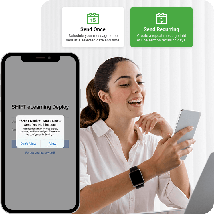Con SHIFT Deploy podrá enviar a audiencias de cualquier tamaño, mensajes instantáneos, programados o recurrentes para estar continuamente informando sobre novedades de la empresa, refrescando material de aprendizaje importante o dando a conocer actualizaciones de producto por ejemplo.